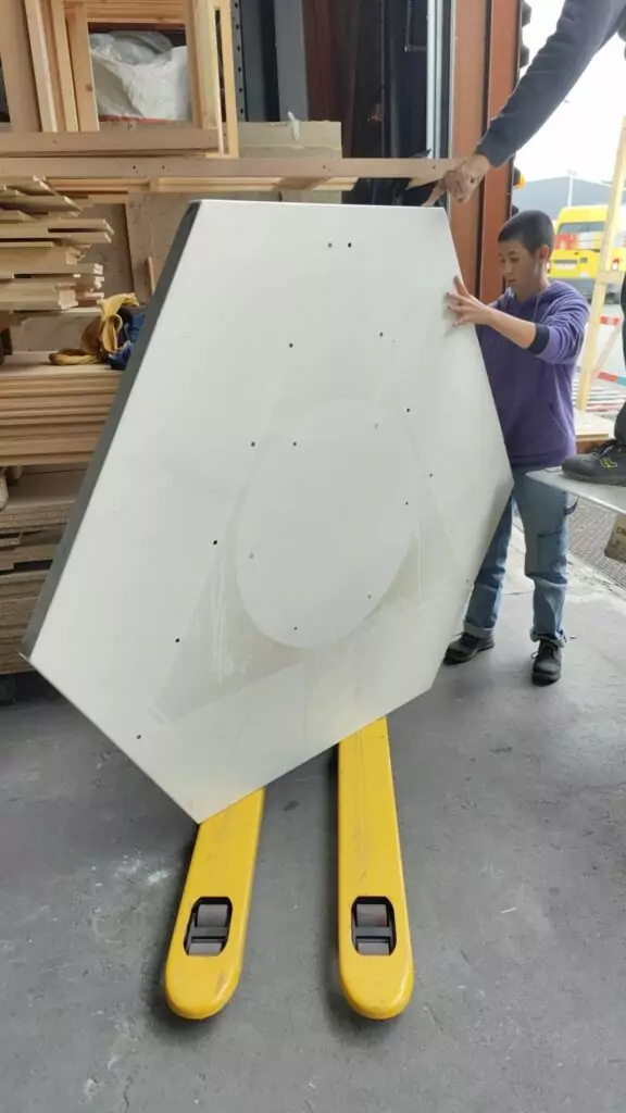 Les étudiant.es ont joué aux « puzzles géants » avec des parquets de scène : tri, assemblage, mesure, photo… tout ce qu’il faut pour que ces matériaux puissent entamer leur seconde vie dans de bonnes conditions.