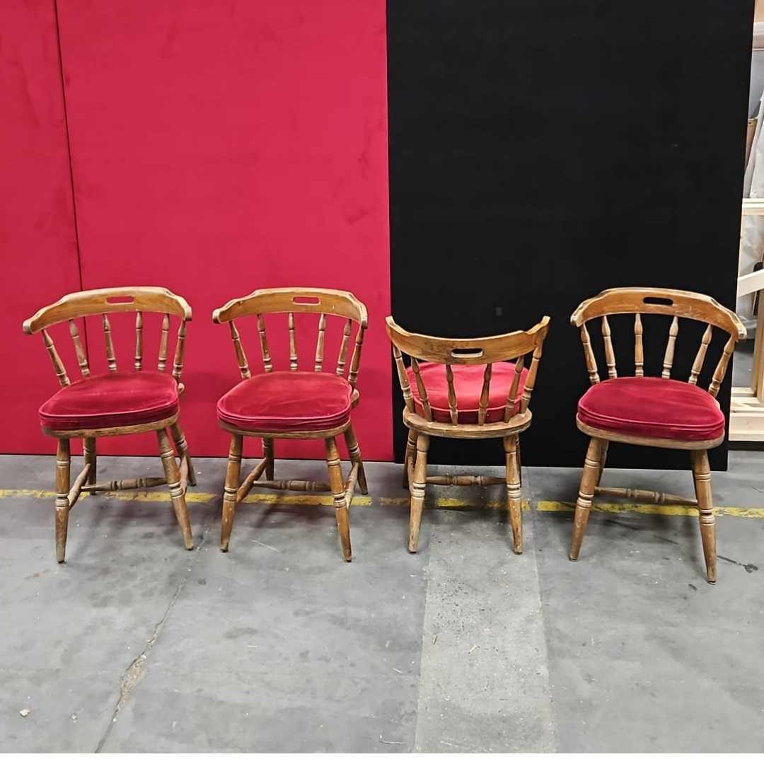 Lot de 4 chaises bistrot anciennes en bois, avec dossier à barreaux et assise rembourrée en velours rouge. Leur style simple et chaleureux évoque facilement l’ambiance d’un café, d’un restaurant ou d’un intérieur populaire, ce qui en fait des chaises idéales pour décor de théâtre, tournage cinéma ou scénographie d’exposition.