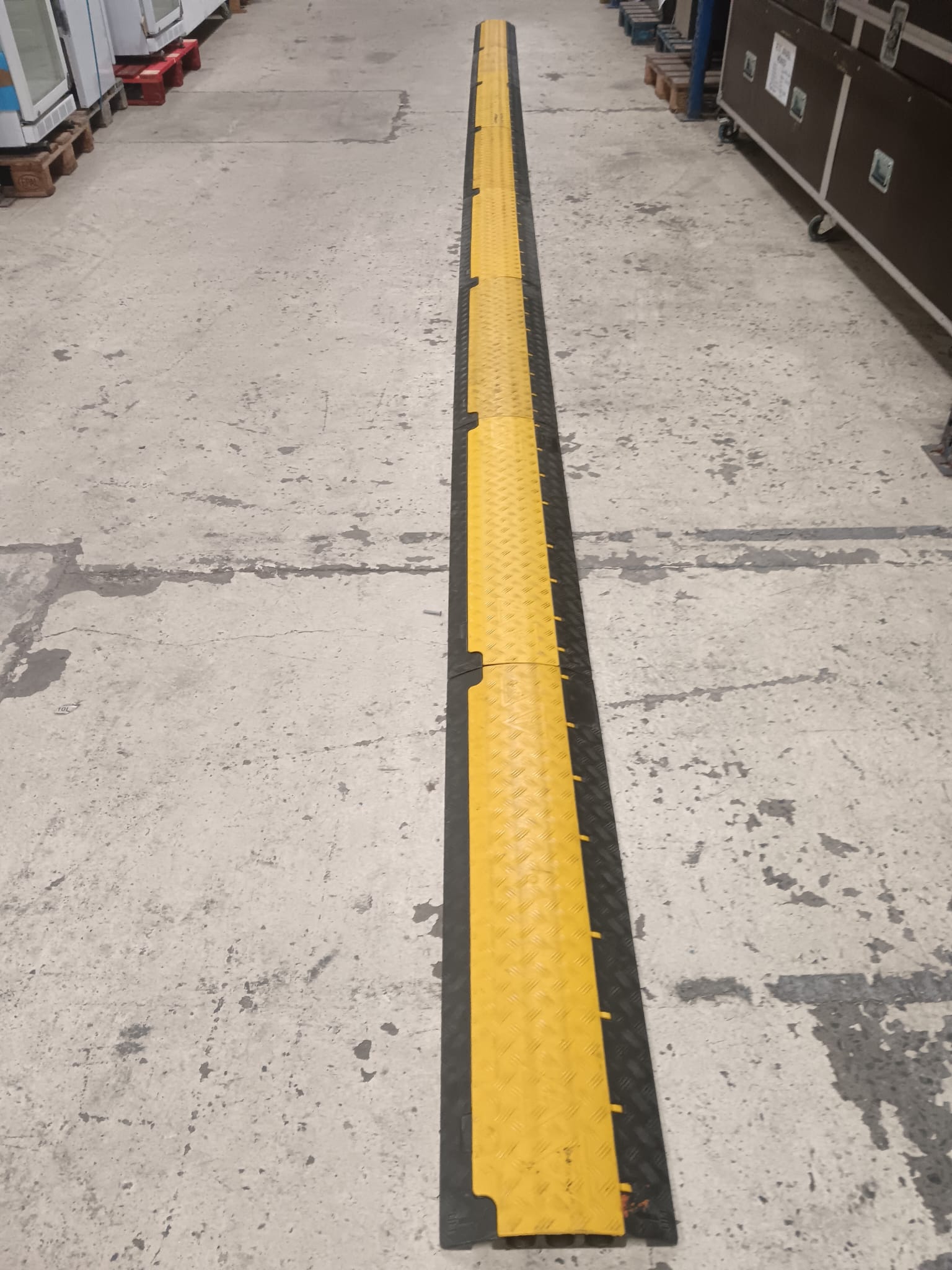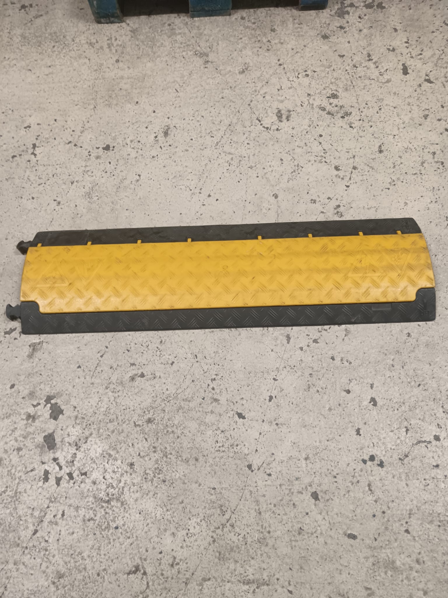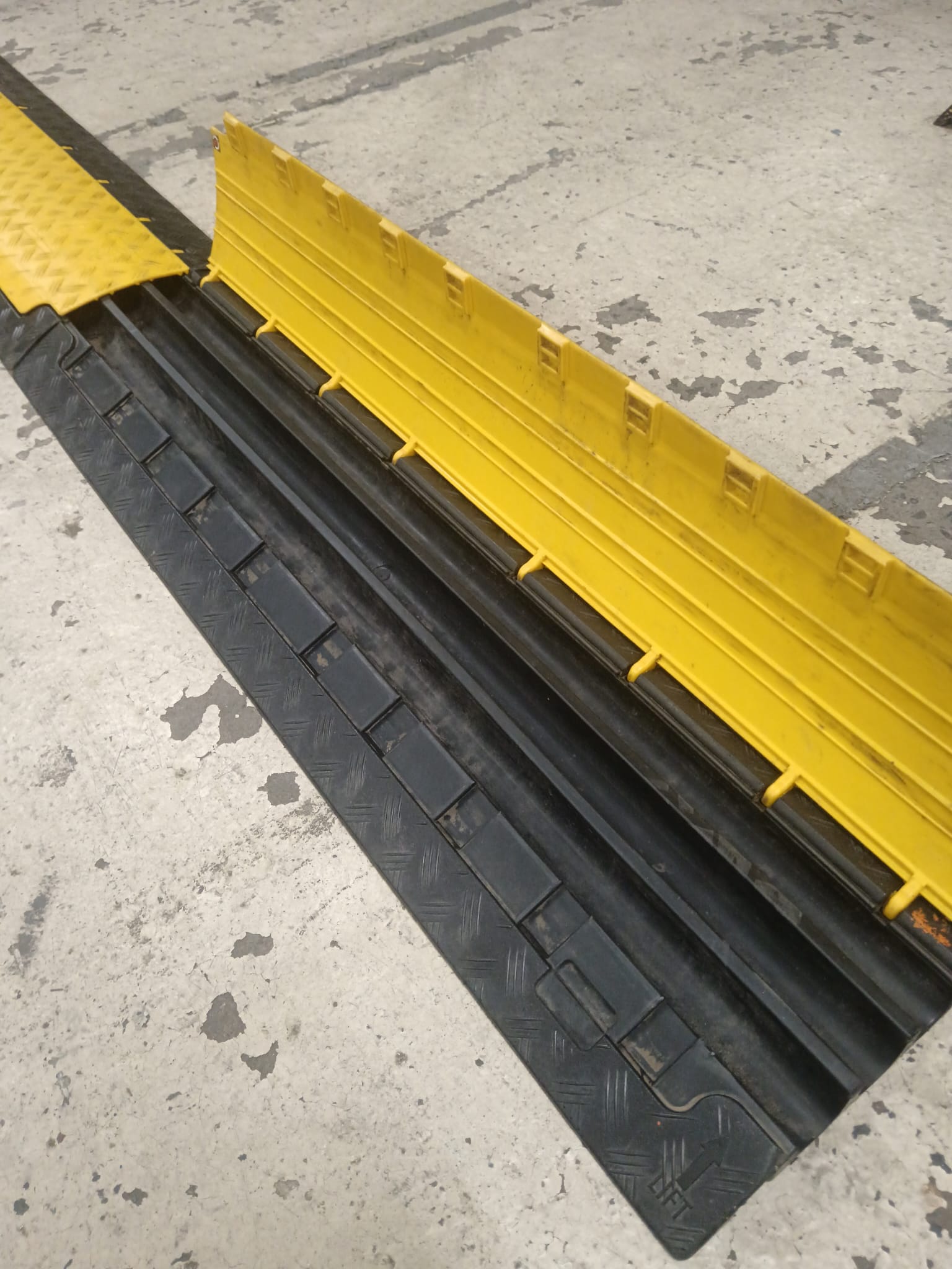 Passe-câbles en caoutchouc avec capot rigide, conçu pour protéger les câbles tout en assurant une circulation sécurisée des piétons, poussettes et personnes à mobilité réduite.