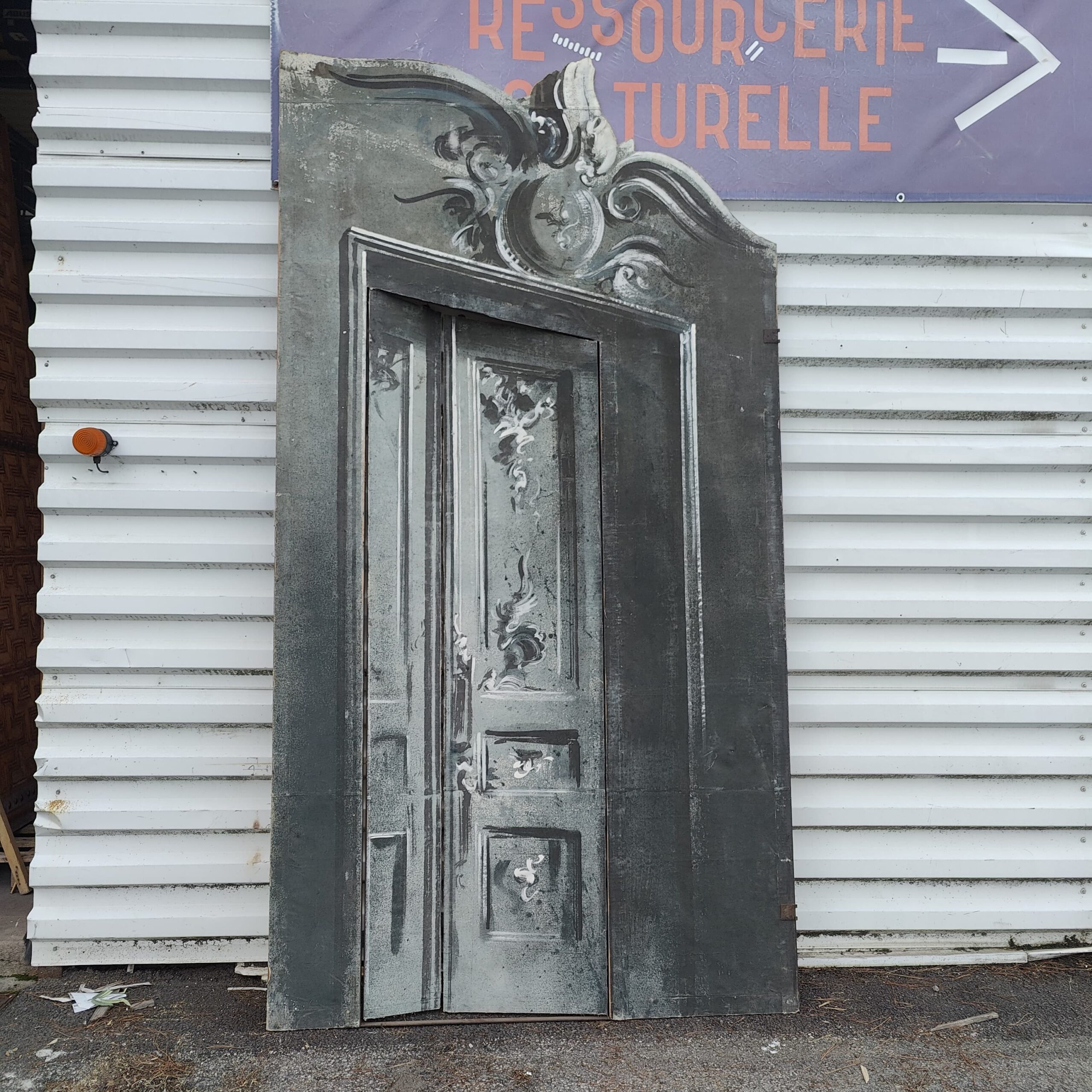 Toile peinte sur châssis bois représentant une porte double en trompe-l’œil, ornée de moulures et motifs dans les tons gris et blancs. Encadrement baroque avec fronton sculpté. L’ensemble évoque l’intérieur d’un palais ou d’un château ancien.