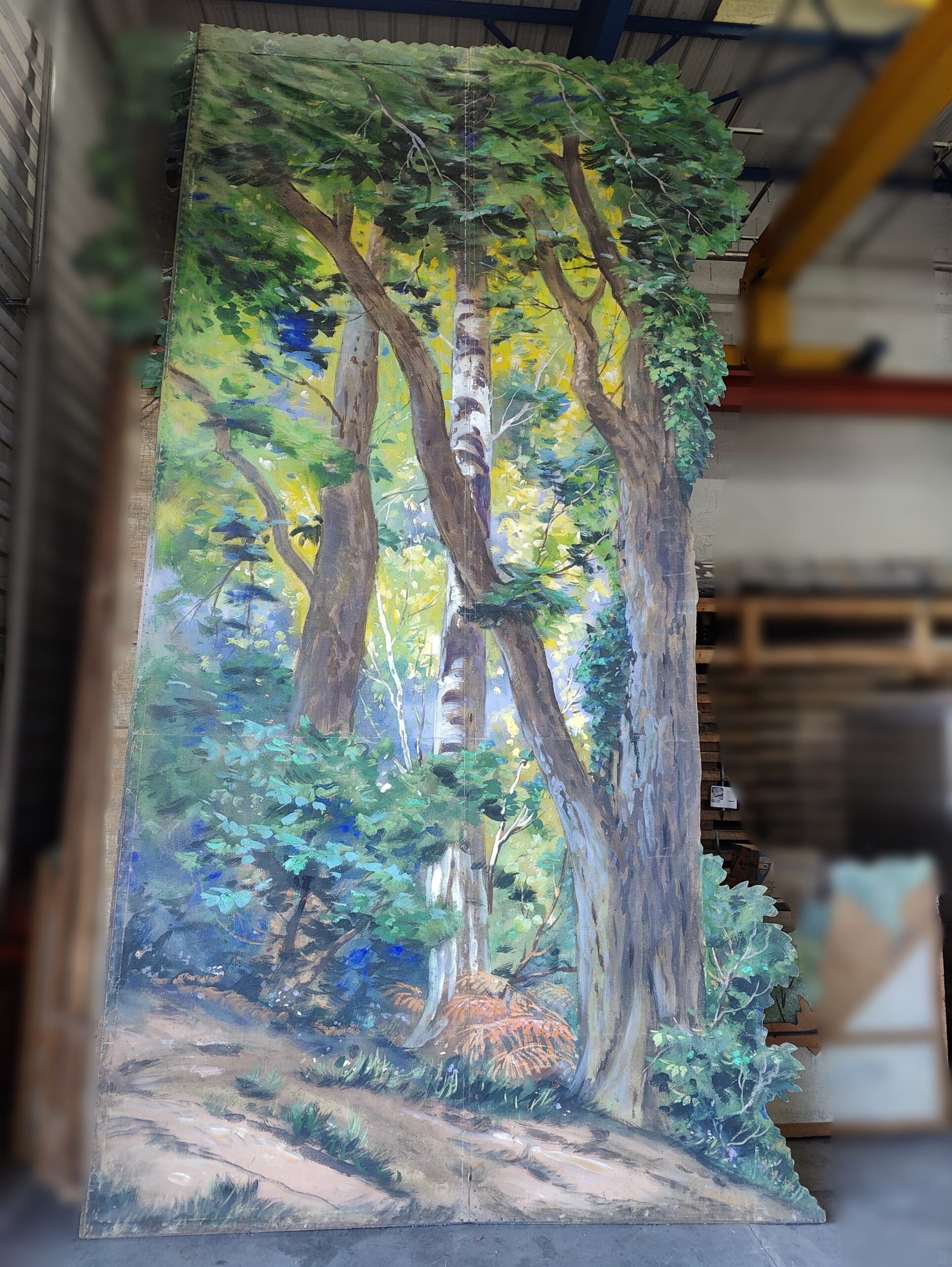 Décor représentant une forêt dense : grands arbres, sous-bois, lumière filtrée.
