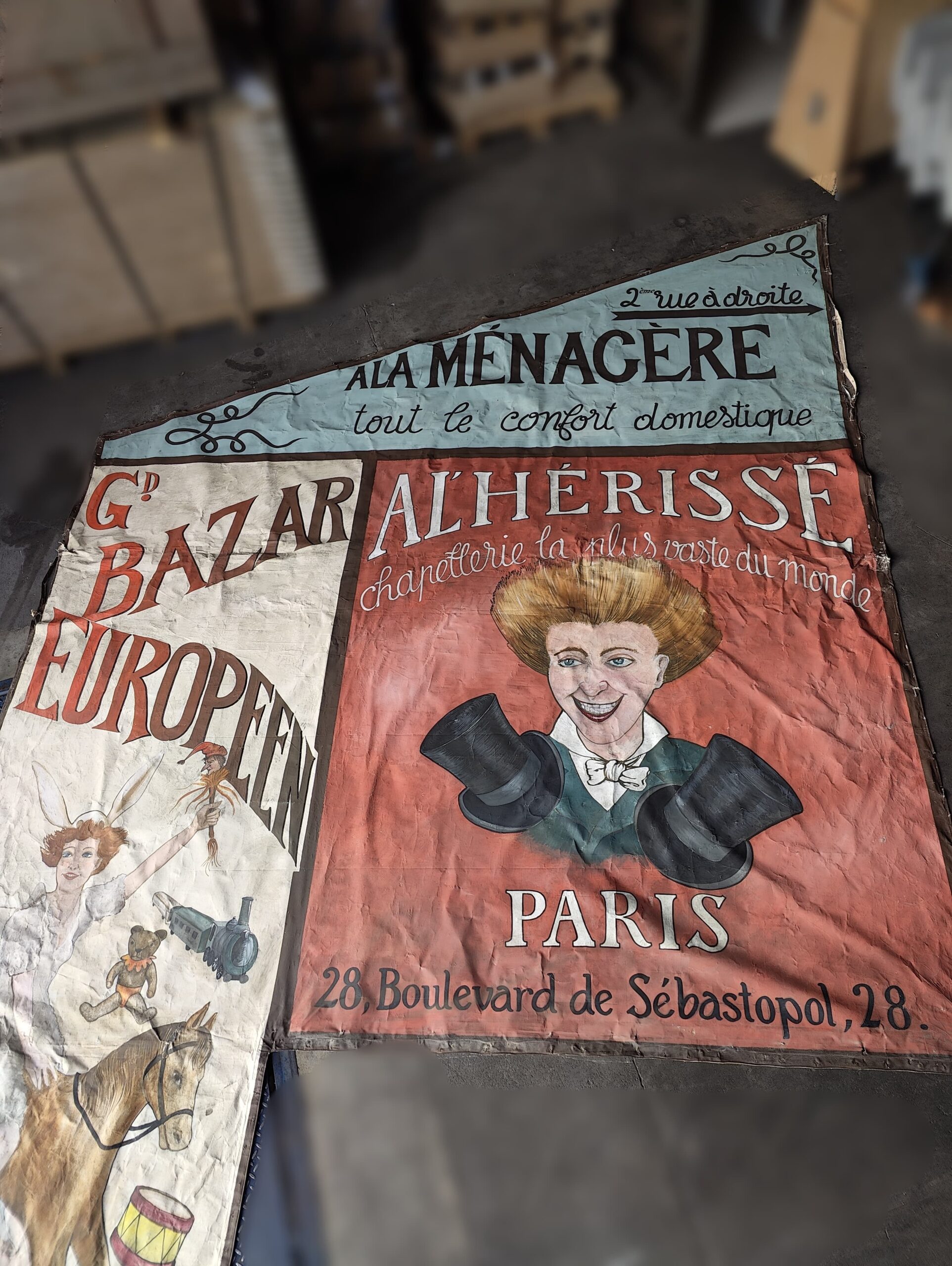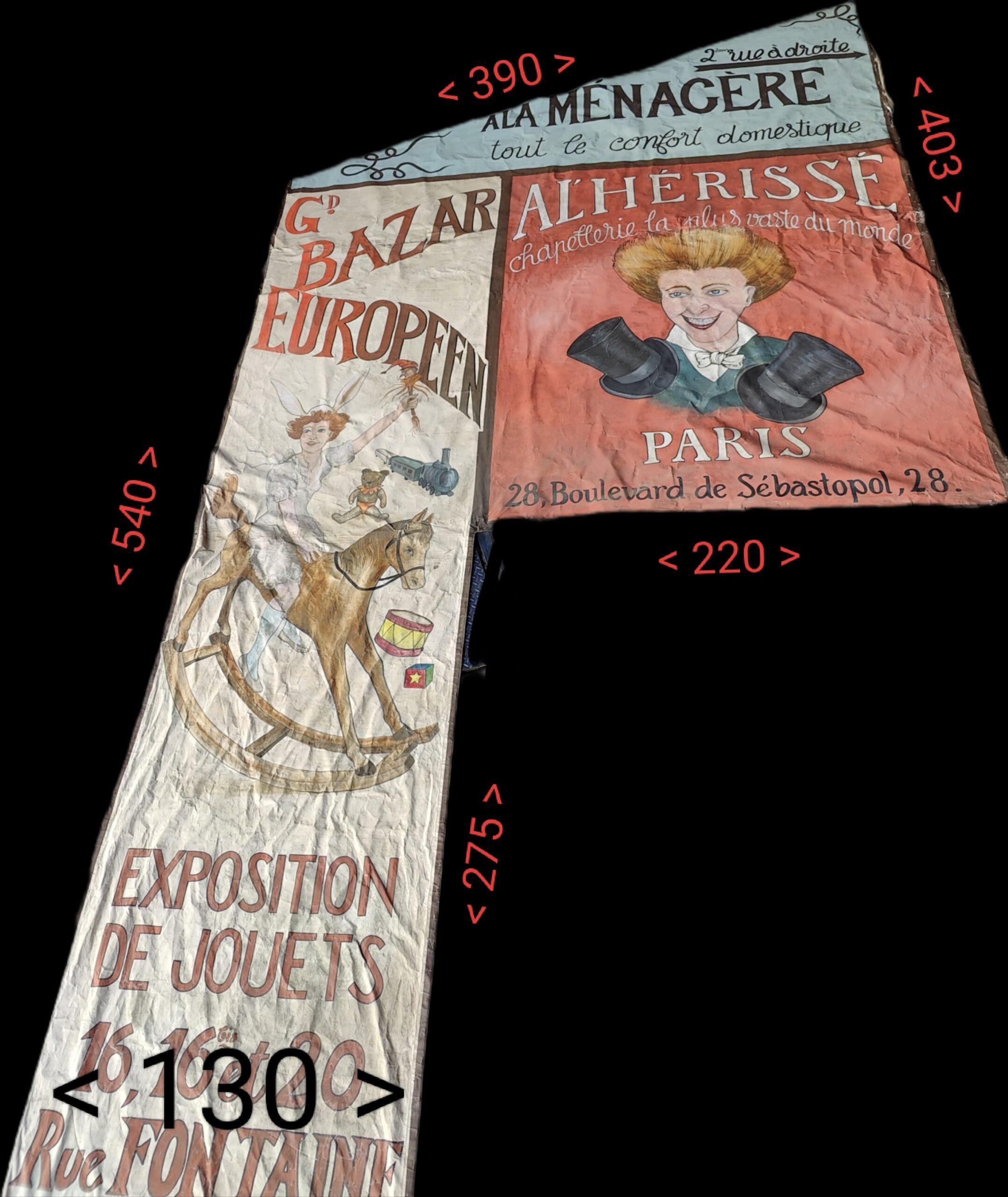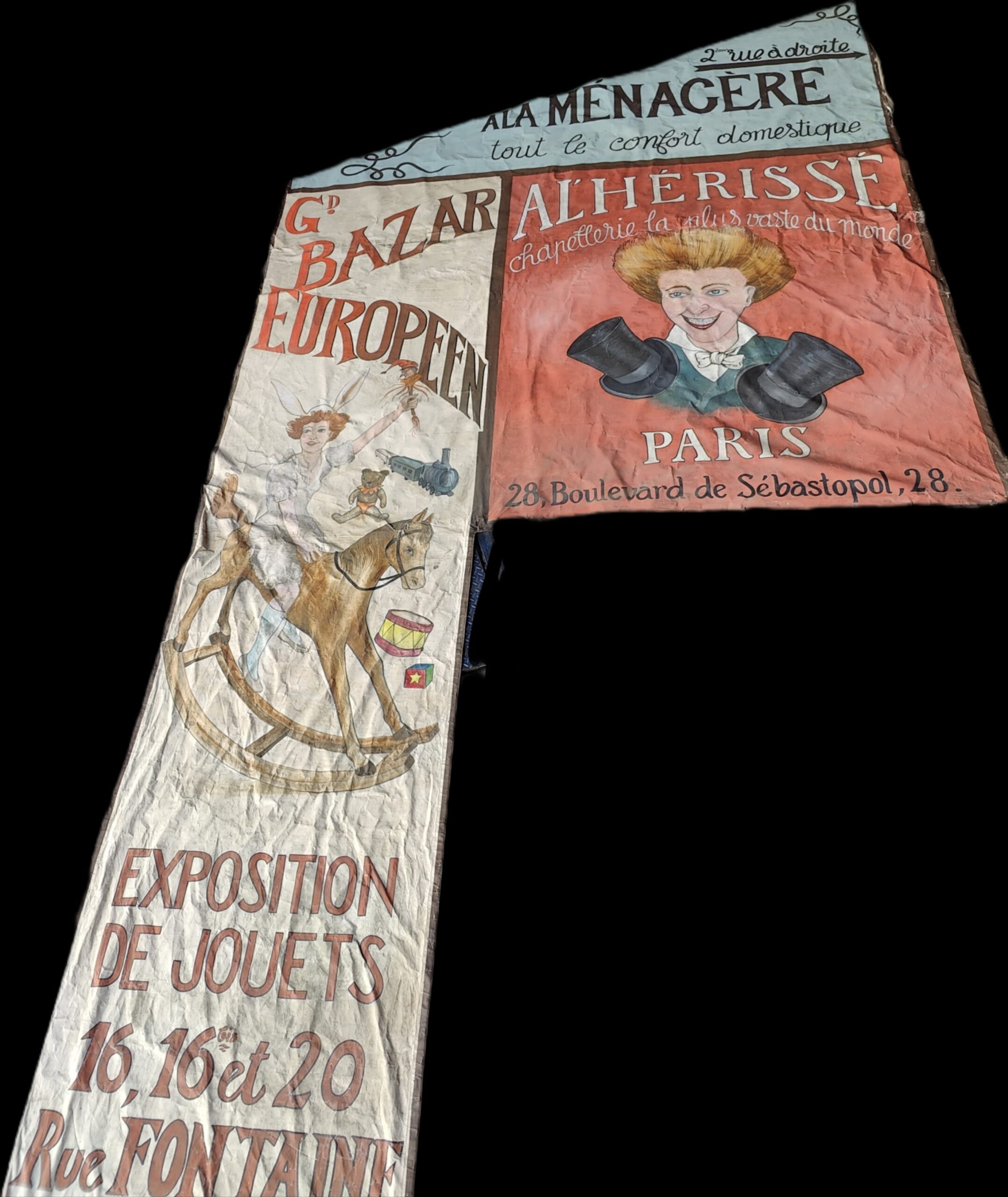 Grand décor publicitaire vintage (jouets, chapellerie, ménagère), style affiches début XXe siècle. A la ménagère, tout le confort domestique, grand bazar européen, exposition de jouets, Altherisse, chapellerie la plus vaste du monde, paris