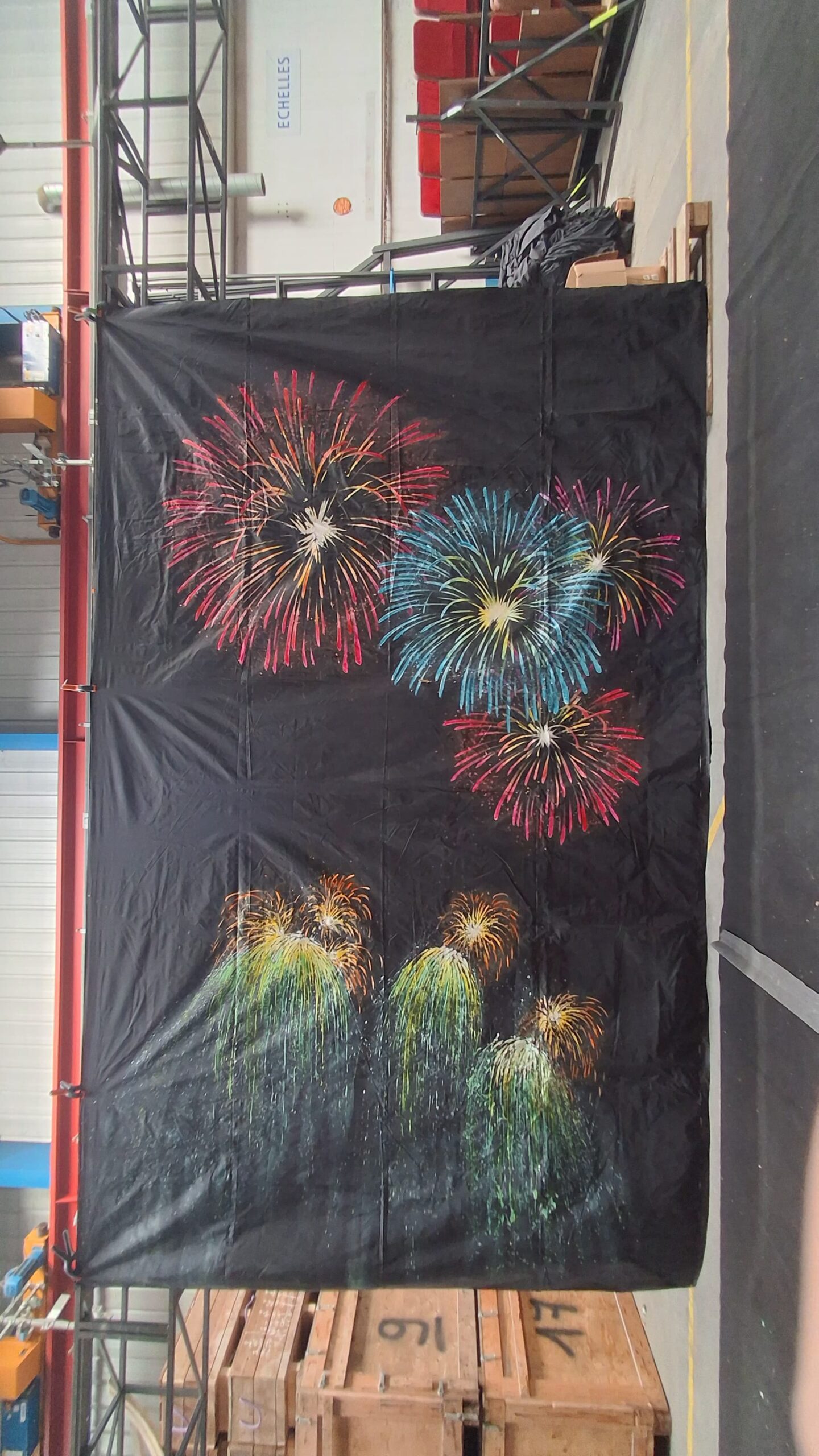 Décor textile représentant un bouquet de feux d’artifice multicolores sur fond noir. Idéal pour une scénographie festive, une ambiance de célébration ou un fond de scène dynamique.