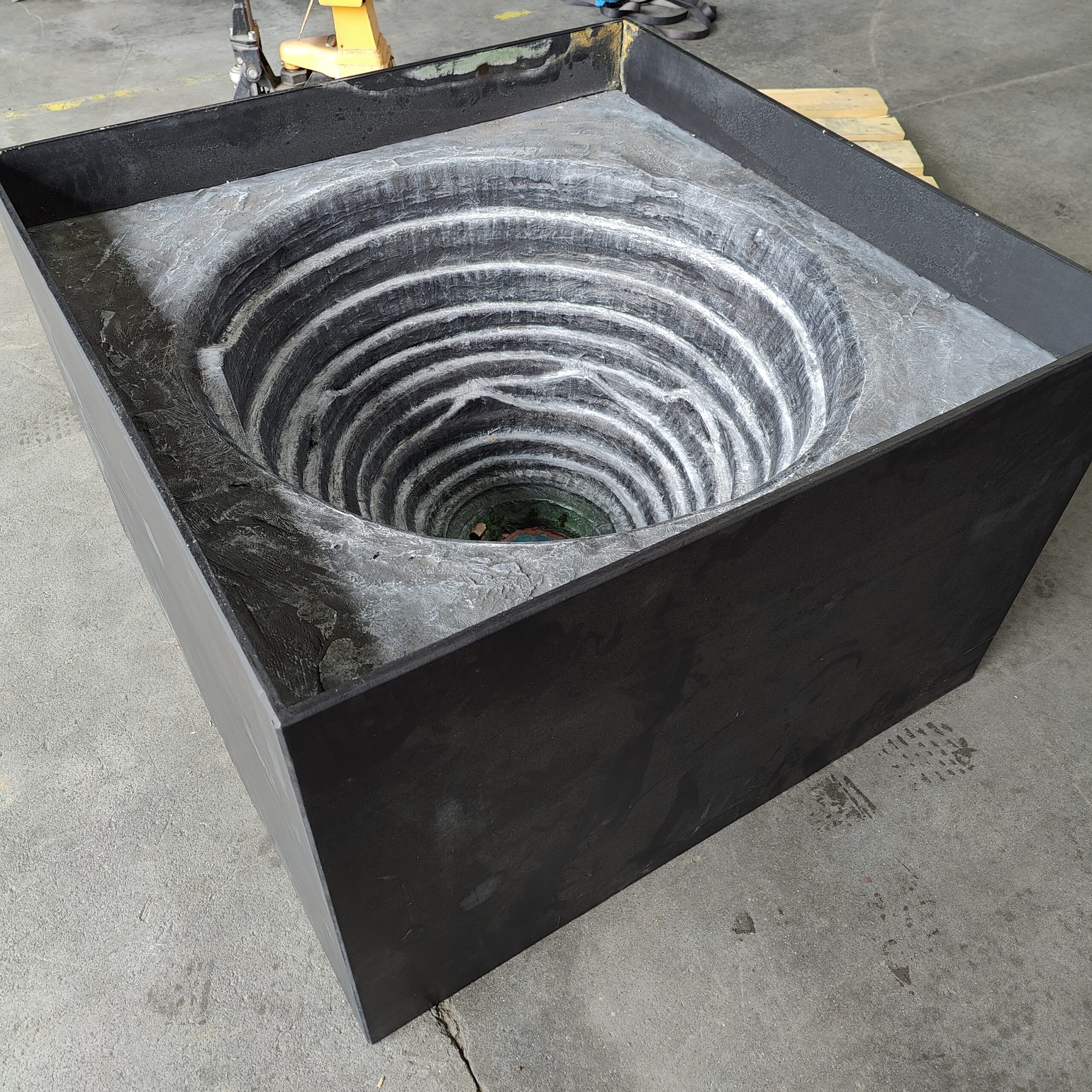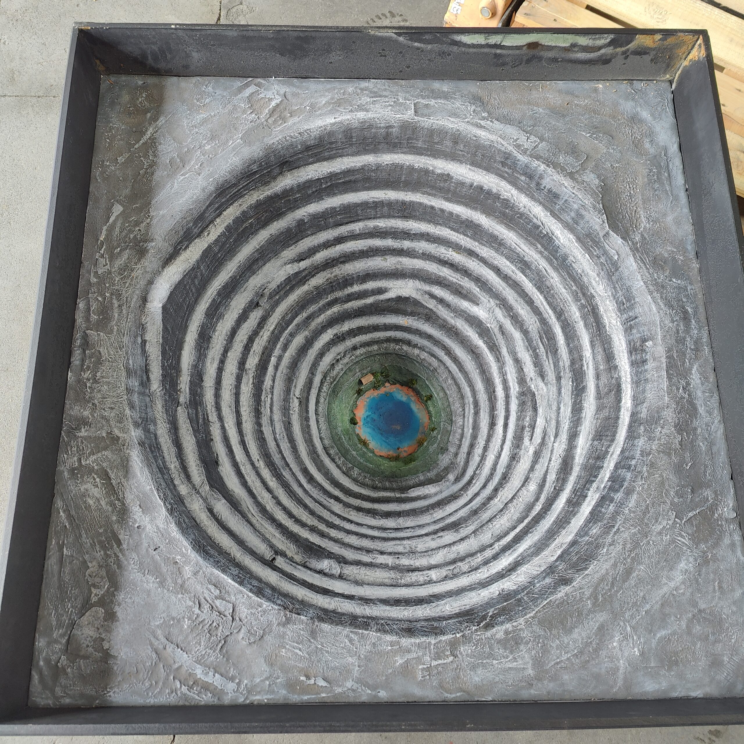 Coffre noir en MDF, intégrant une maquette en polystyrène sculpté représentant un relief type cratère ou carrière, idéale pour des décors immersifs, des maquettes de scénographie ou des dispositifs pédagogiques.