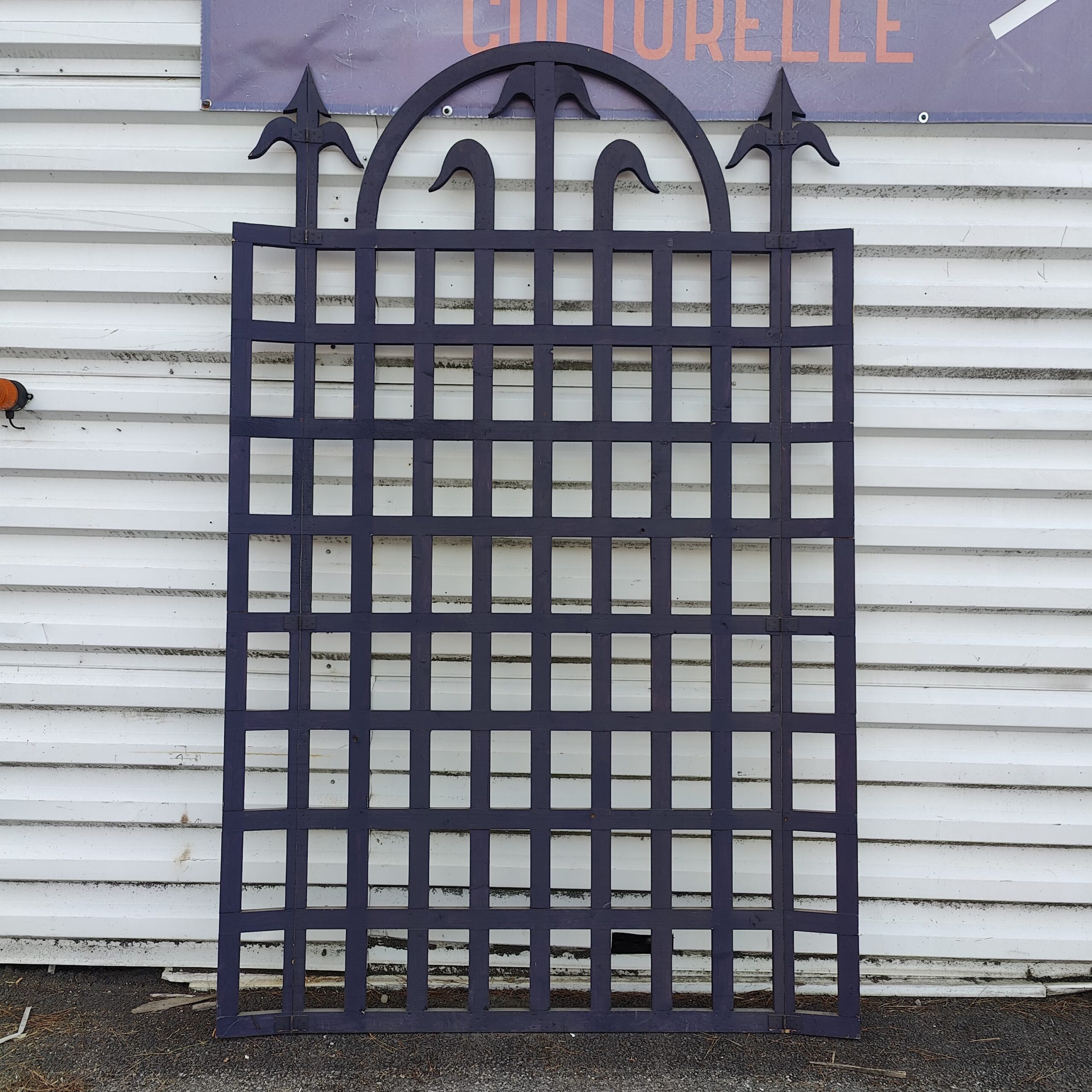 Structure en tasseaux peints, motif grille / portail décoratif avec pointes stylisées.