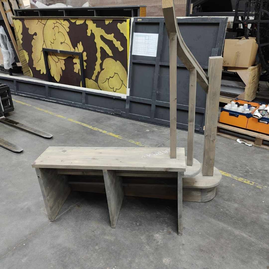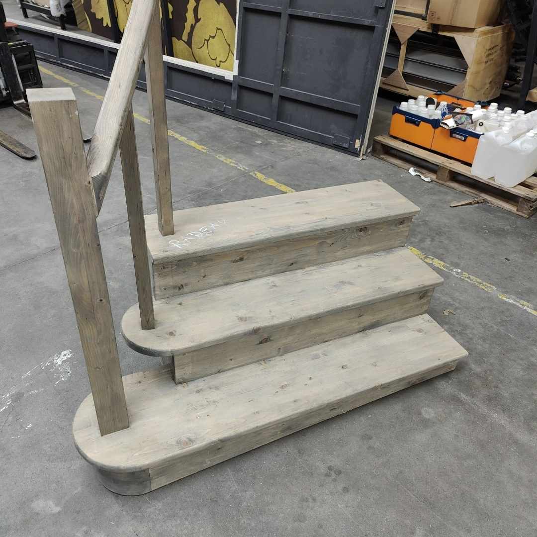 Escalier en bois à pente marquée, conçu comme élément de décor pour scénographie et aménagement de plateau.