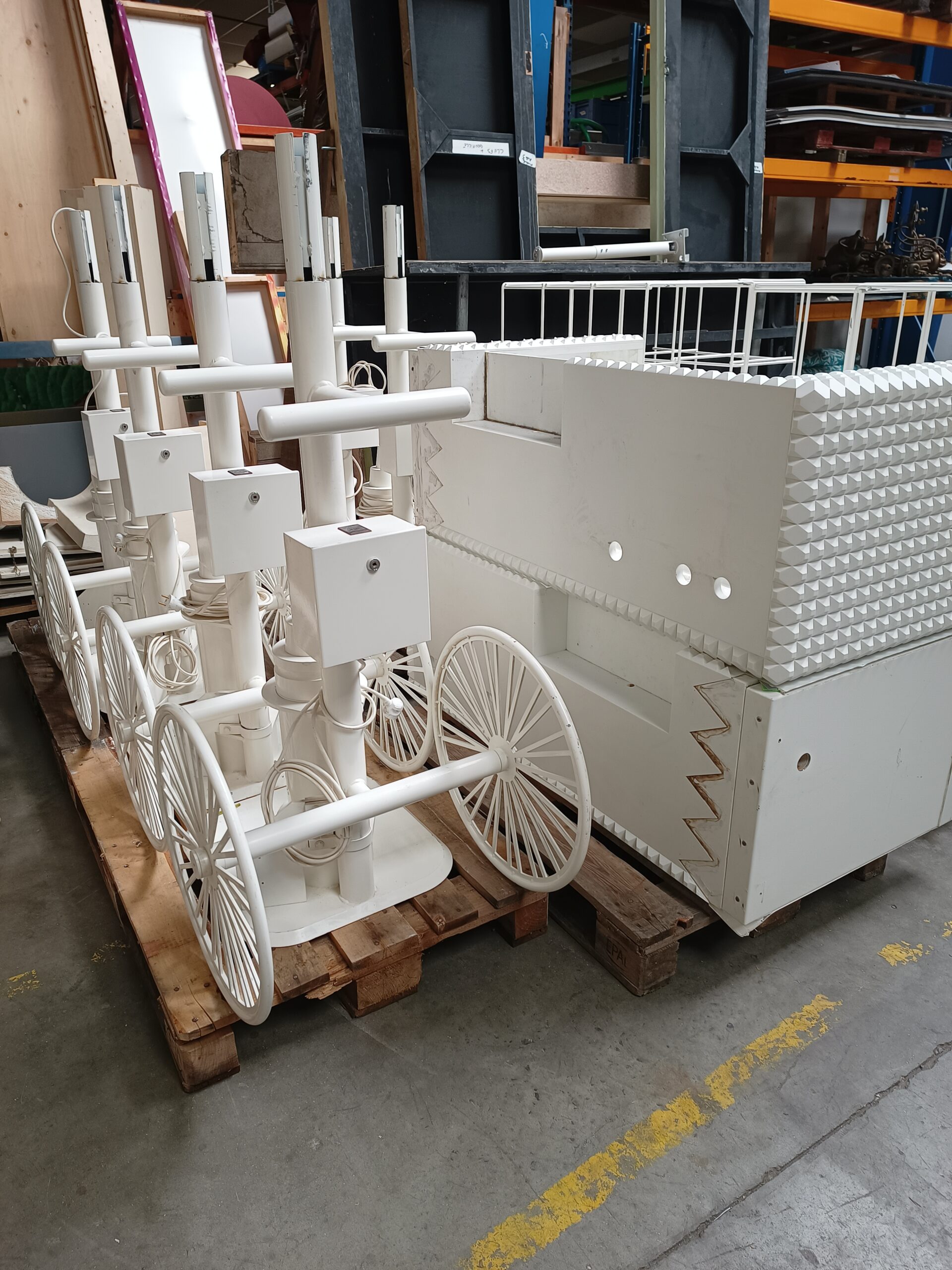 Structure esthétique en métal composée d’un socle à l’esthétique roue et d’un mât avec bras déporté.