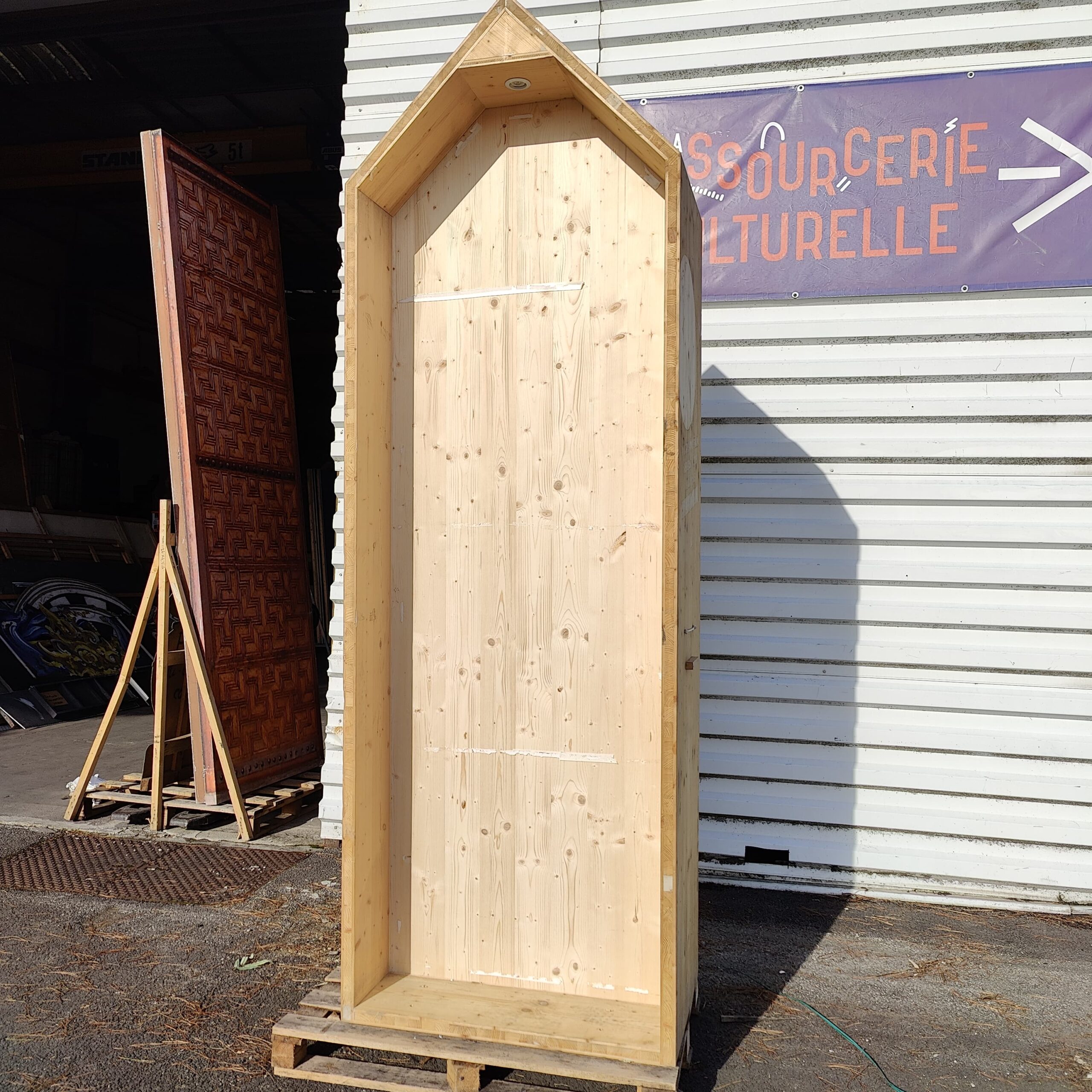Elle peut être utilisée en mobilier urbain éphémère, en élément scénographique ou comme support de médiation grâce à son fond prévu pour accueillir un visuel (non fourni).