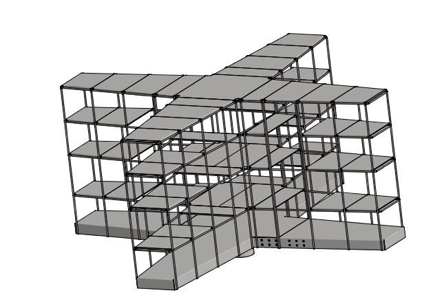 Configuration en croix avec étagères sur plusieurs niveaux.