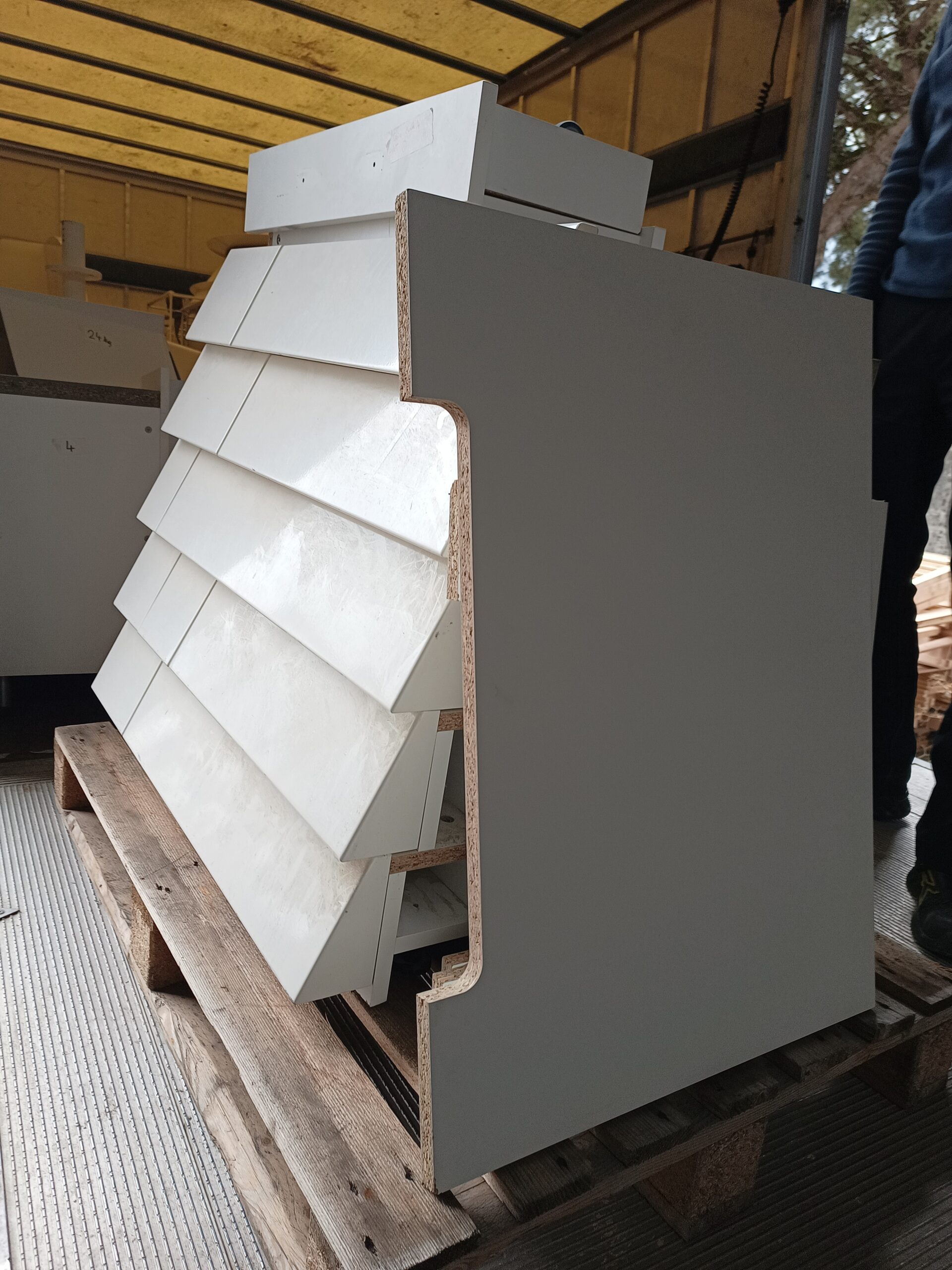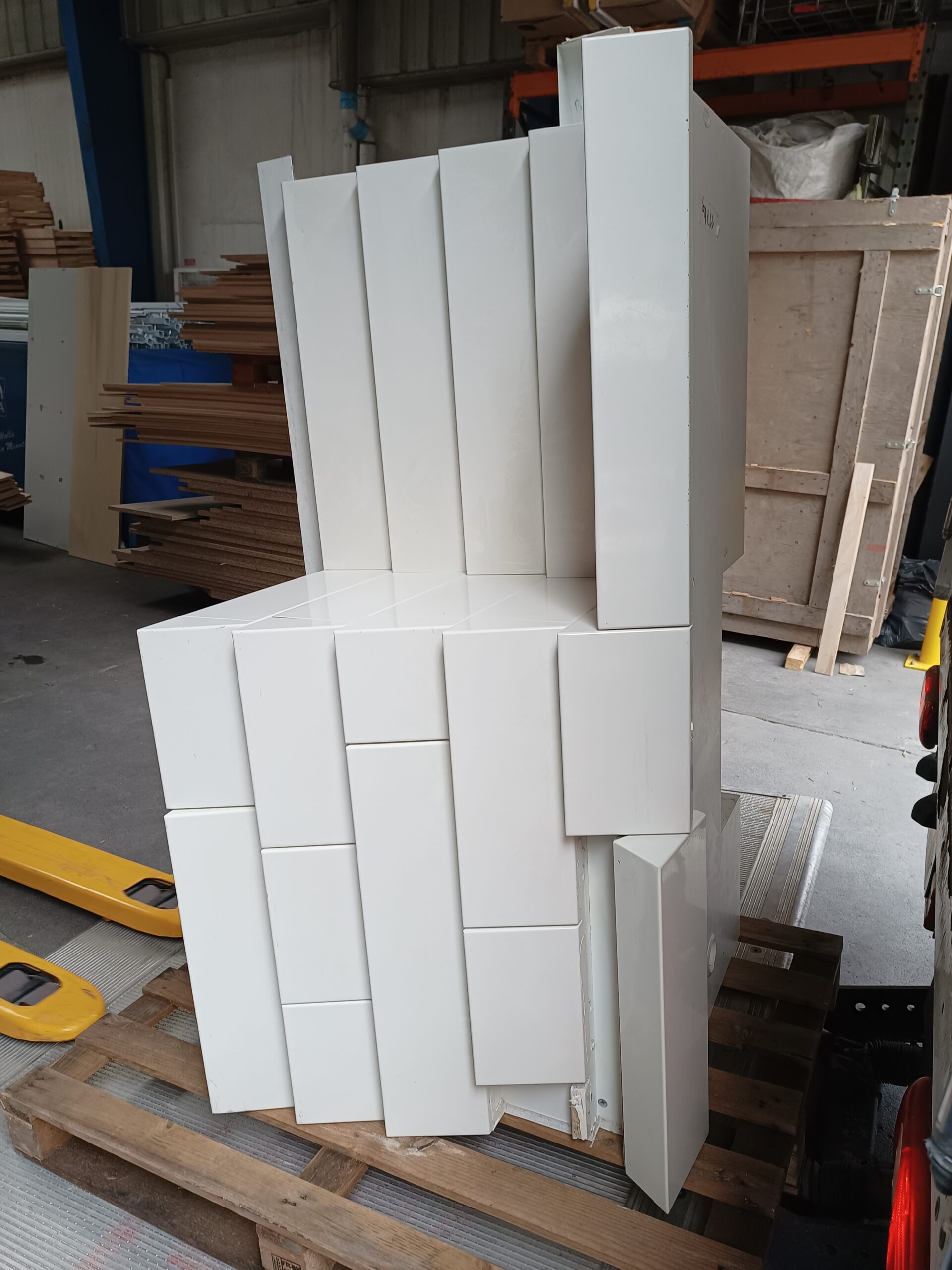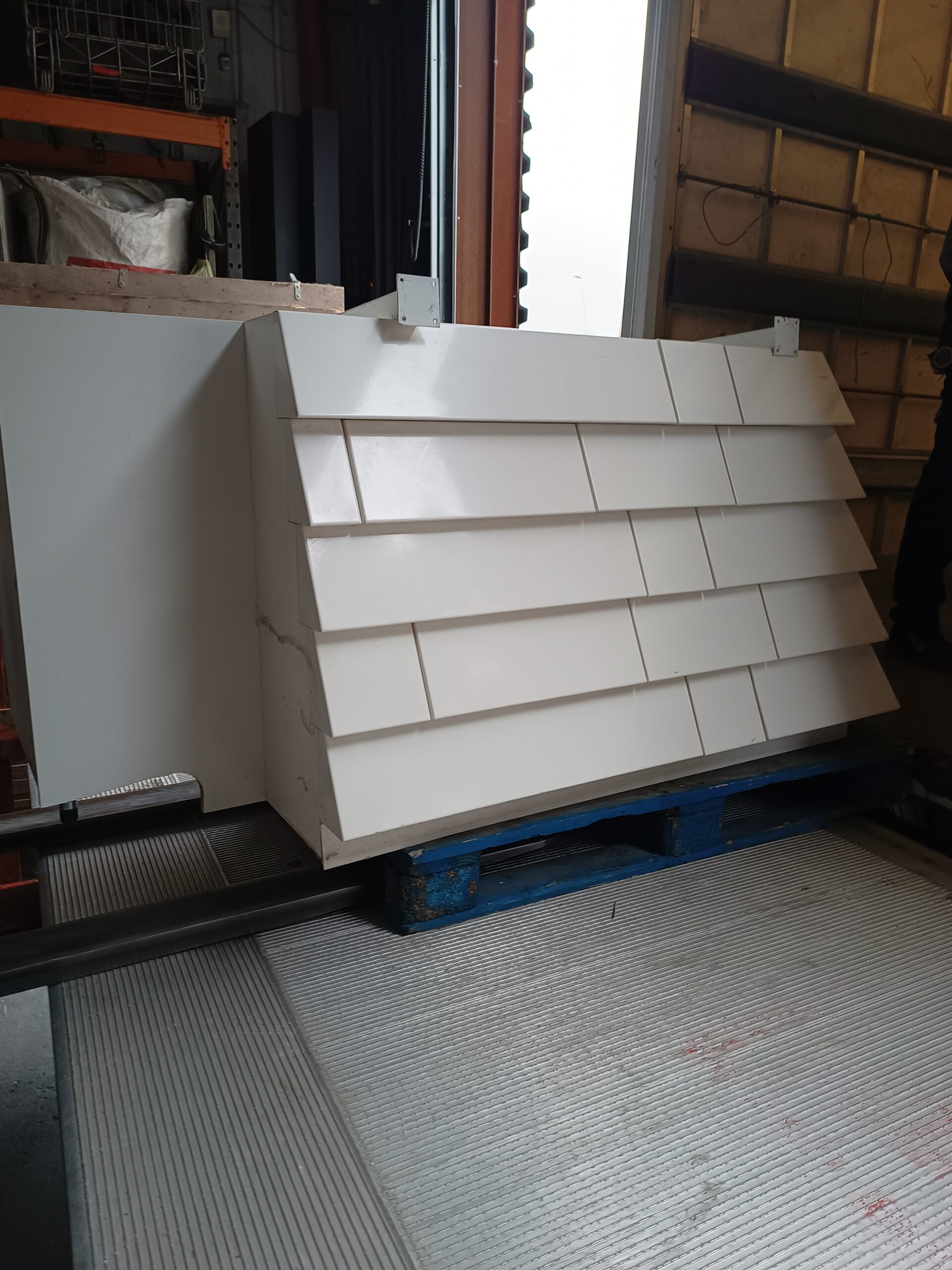 Les façades avant présentent un effet bardage horizontal blanc brillant, apportant un rendu épuré et professionnel.