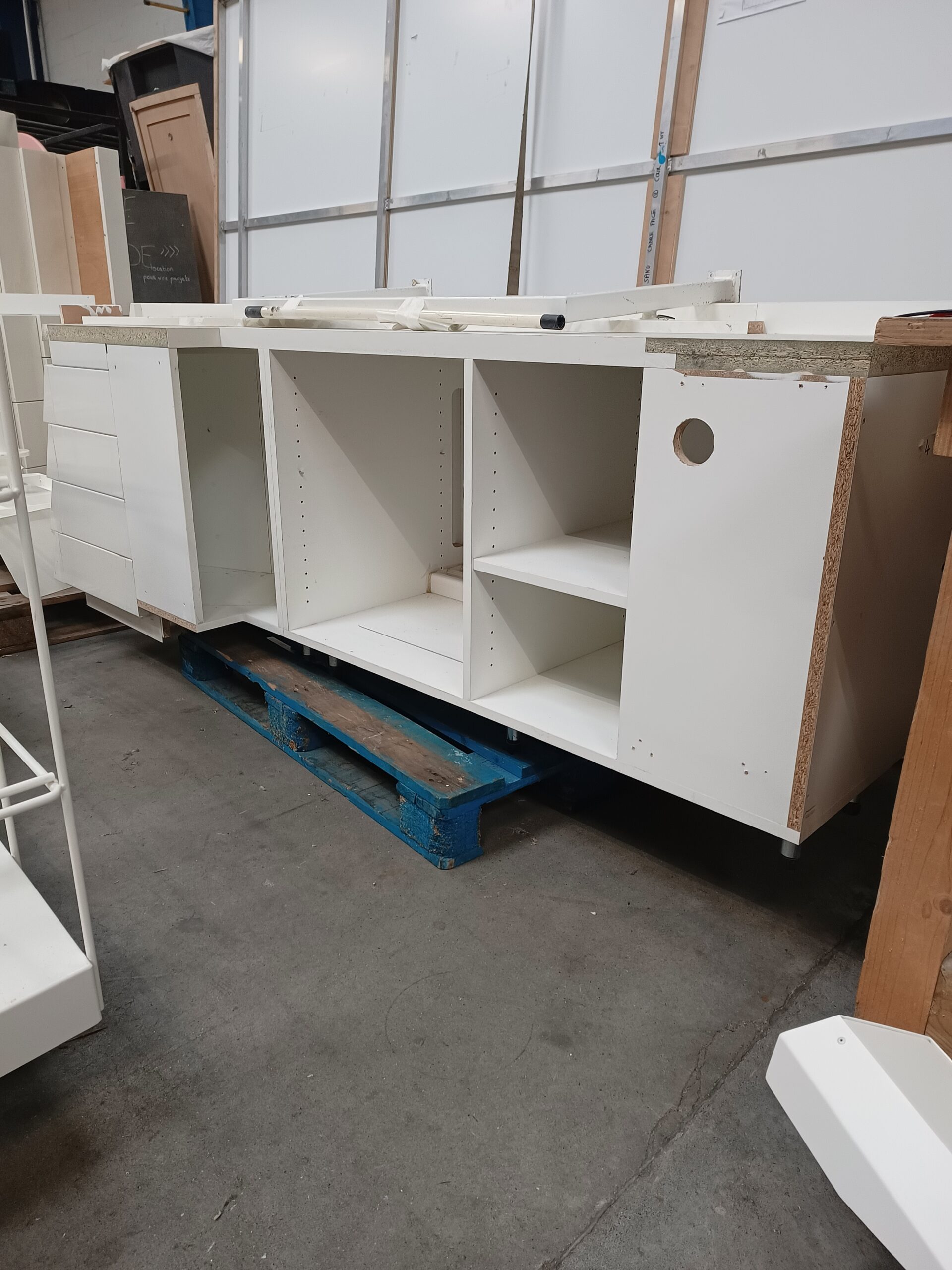 Dimensions du lot complet : environ 2.35 m de long x 2.10 m de profondeur pour les 2 modules installés en angle + 87 cm pour le module présentoir. hauteur 80 cm