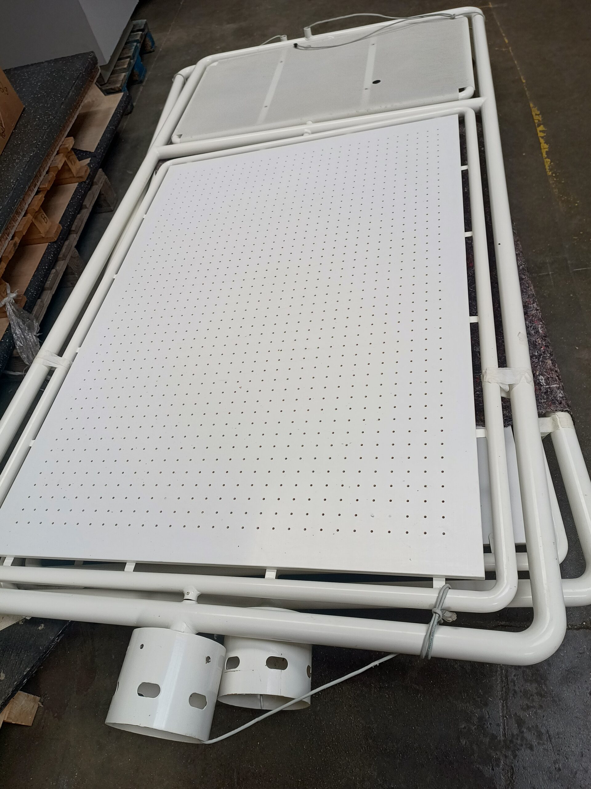 Sa structure intègre deux zones : une partie supérieure pleine (pour affichage fixe ou visuel principal) et un panneau perforé inférieur (pour supports ou accrochages modulables).