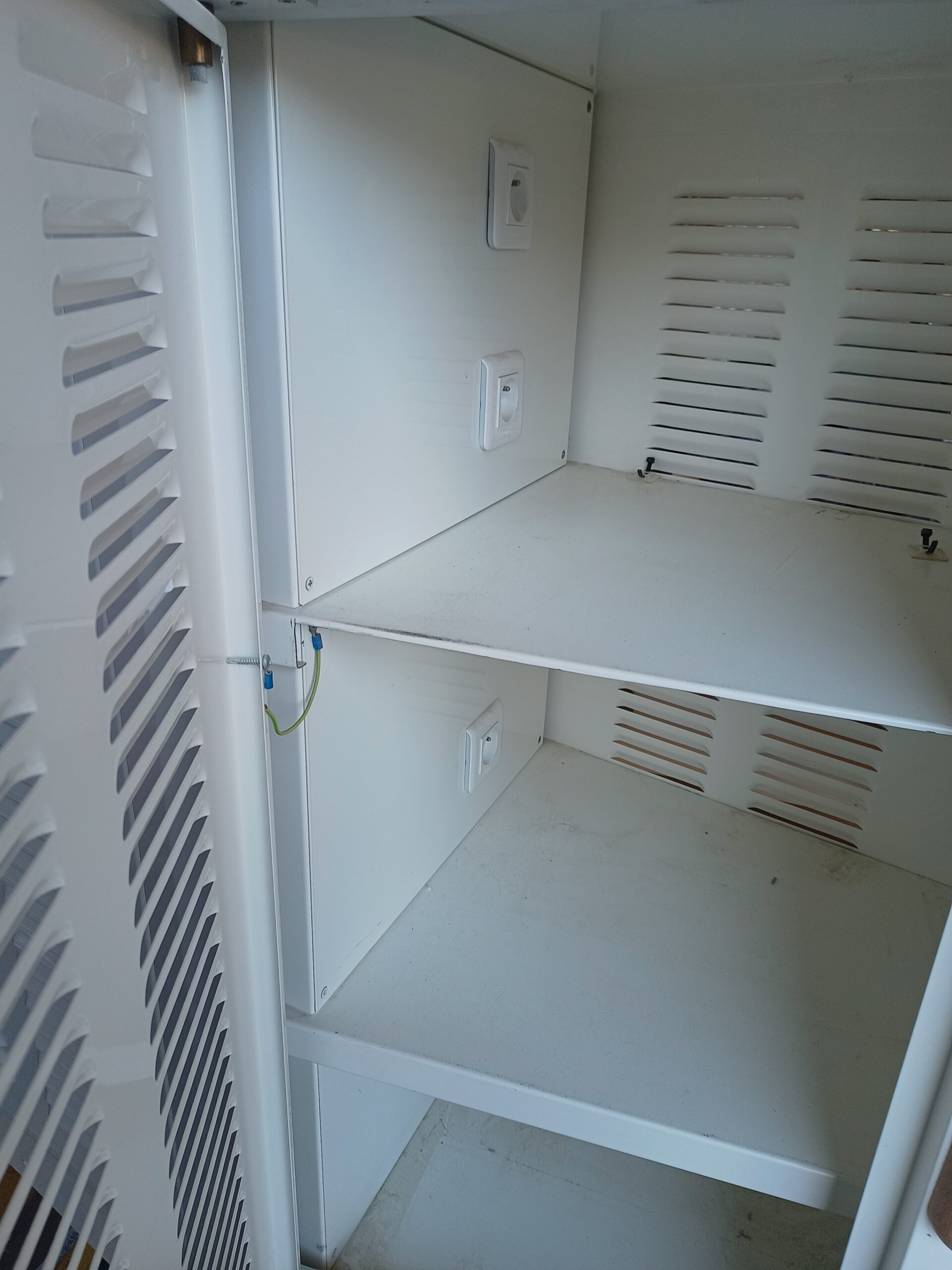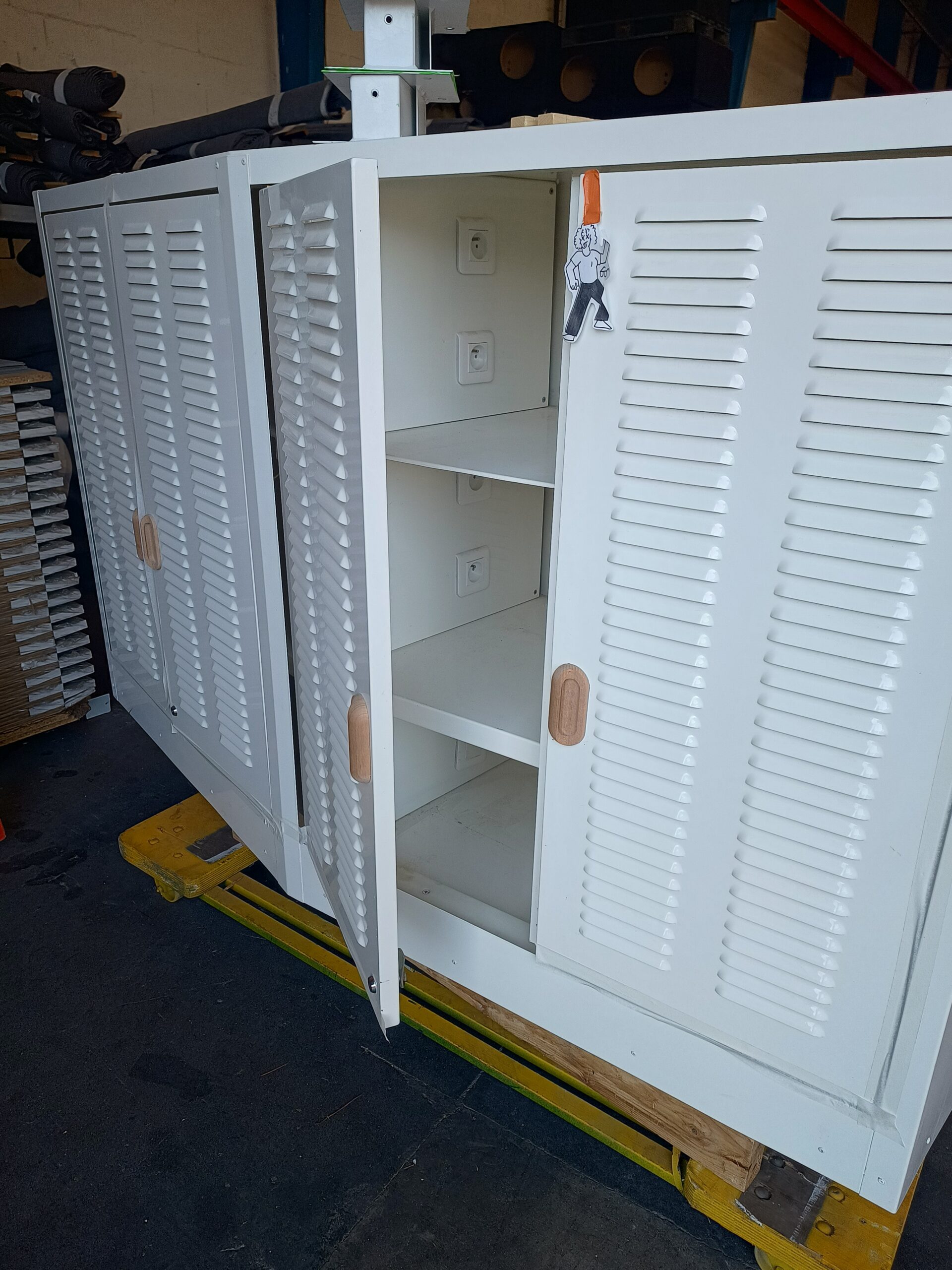 Placard en métal laqué blanc, ajouré sur les portes et les parois pour une meilleure ventilation.