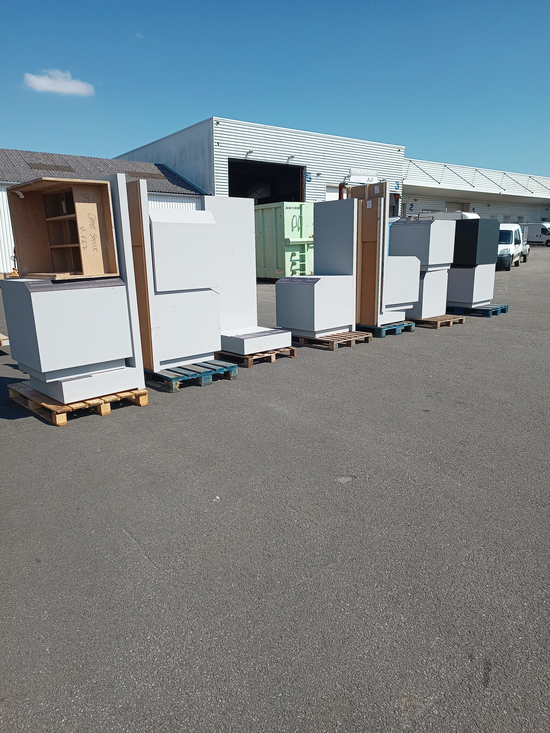 Modules de stèles issus d’une exposition, conçus pour la présentation d’œuvres, de textes ou d’objets. Fabriqués en medium peint, avec surfaces inclinées pour supports de médiation. Leur design sobre permet une intégration facile dans différents contextes scénographiques ou muséographiques.