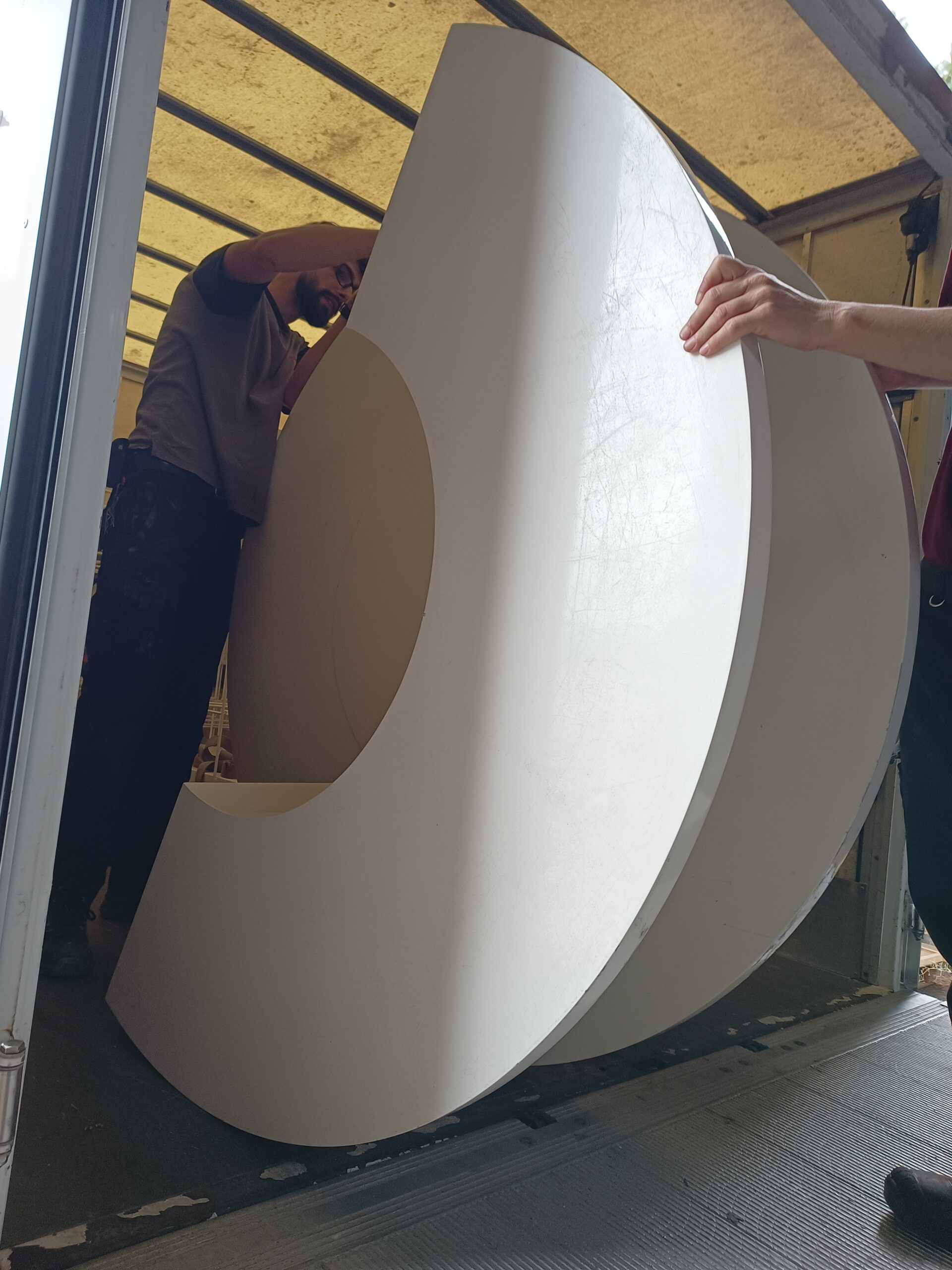 Table en métal blanc, adaptée pour des usages de médiation, d’exposition ou d’accueil du public dans un espace culturel.