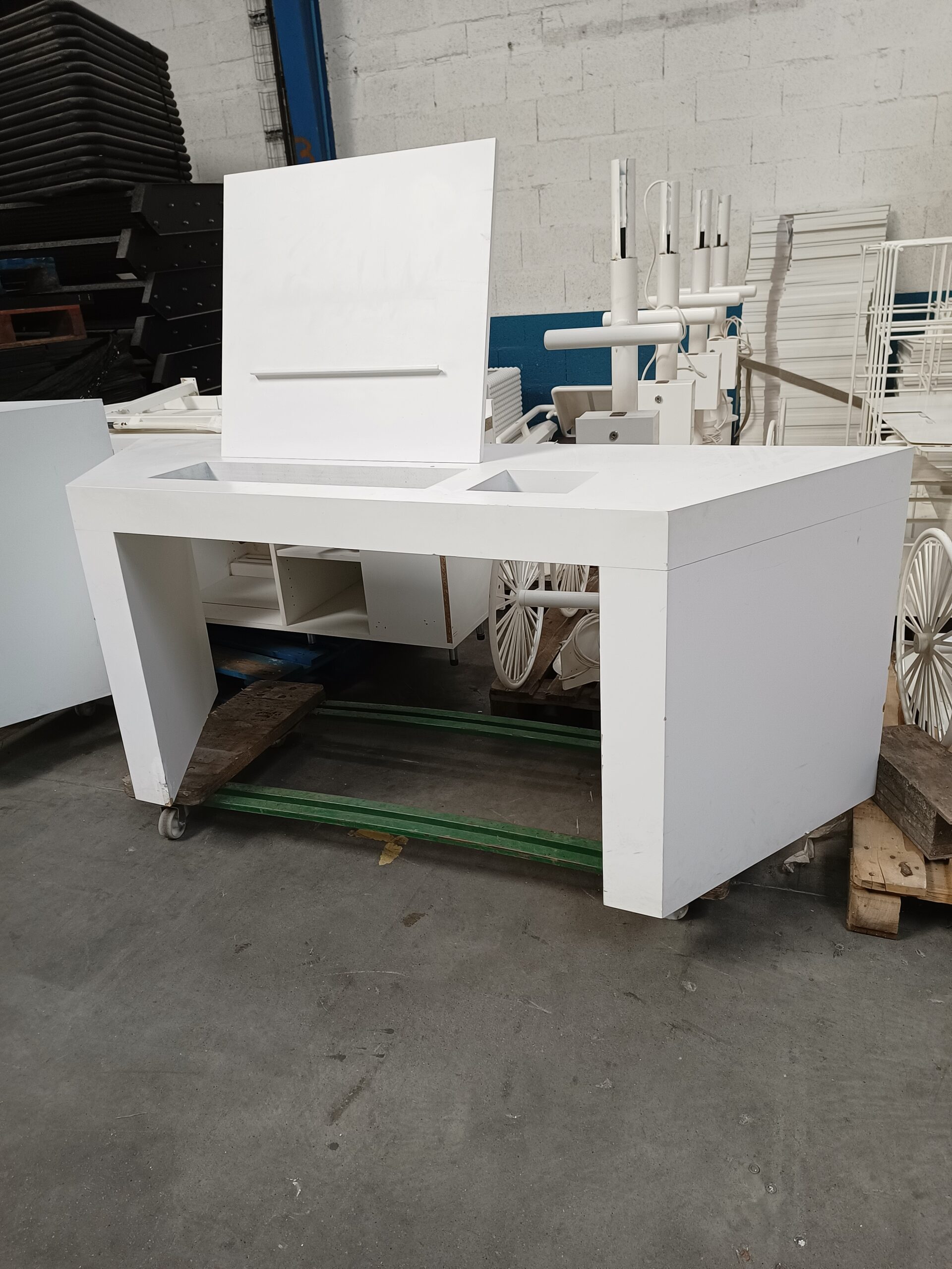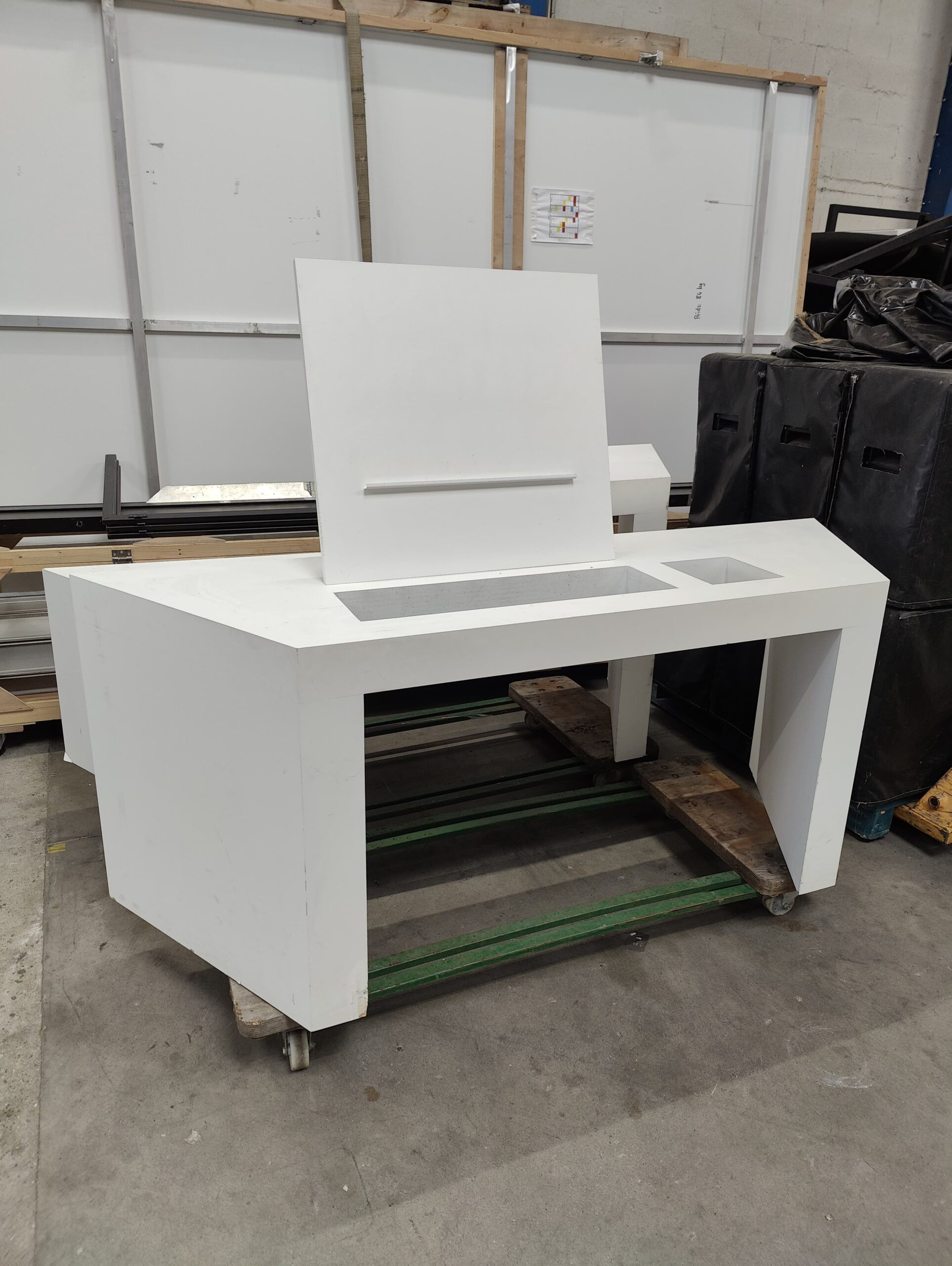 Table de présentation muséographique avec structure blanche et panneau d’exposition intégré