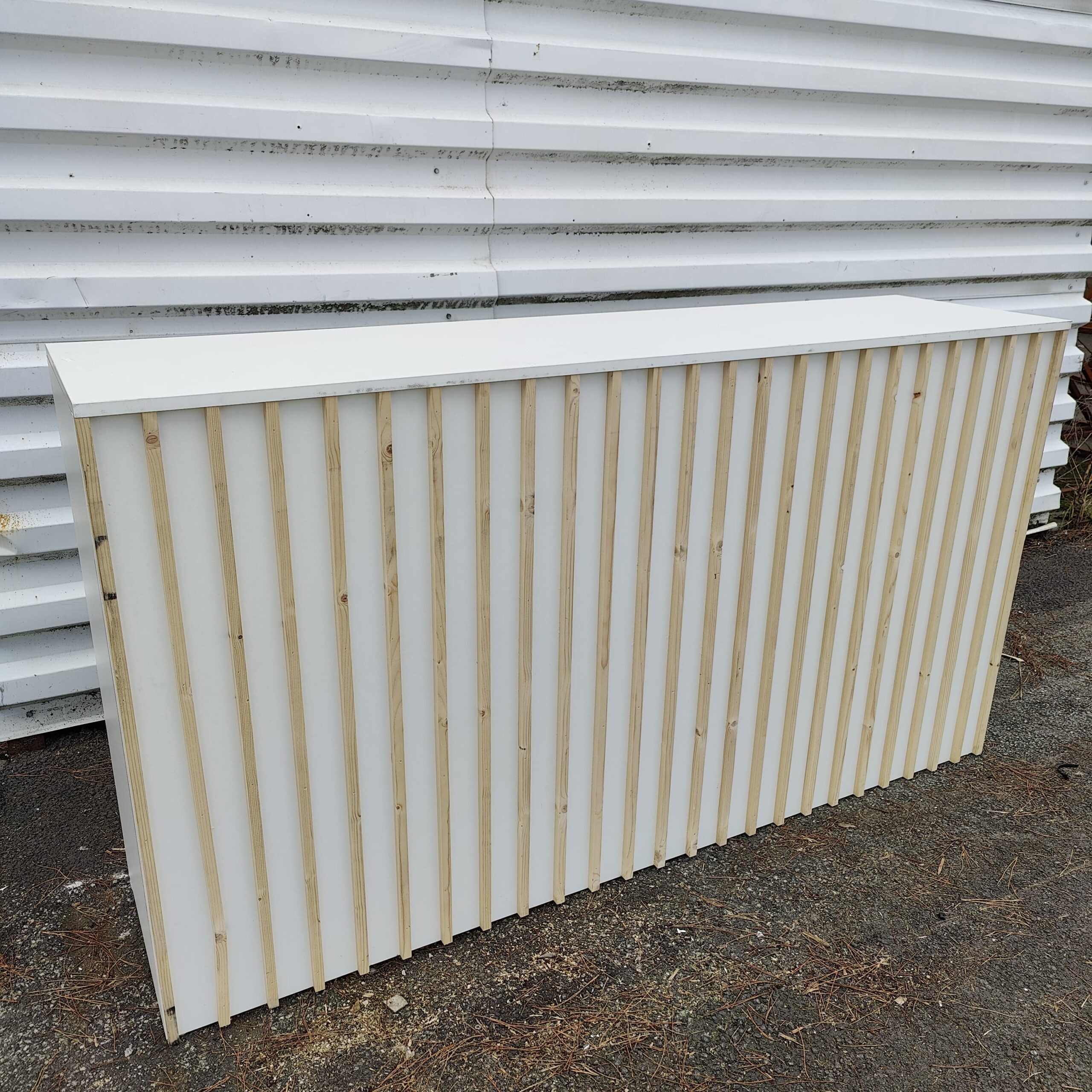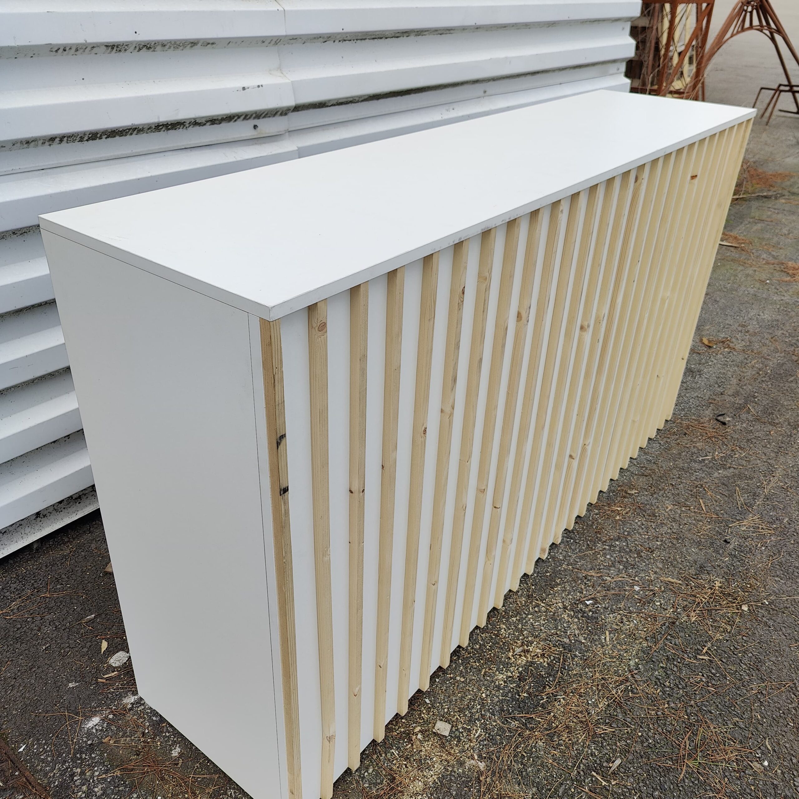 Façade décorative composée de tasseaux en bois brut fixés verticalement.